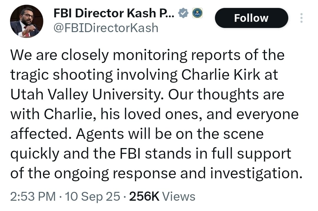FBI Director Kash Patel says agents are heading to the scene where pro-Israel influencer Charlie Kirk was shot