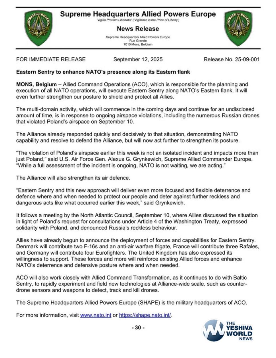 NATO Secretary General Mark Rutte announced the launch of Operation “Eastern Sentry” to bolster defenses in Poland and the Baltics after Russian drone incursions, with Denmark, France, and Germany already pledging fighter jets and naval support, and more allied contributions expected soon.