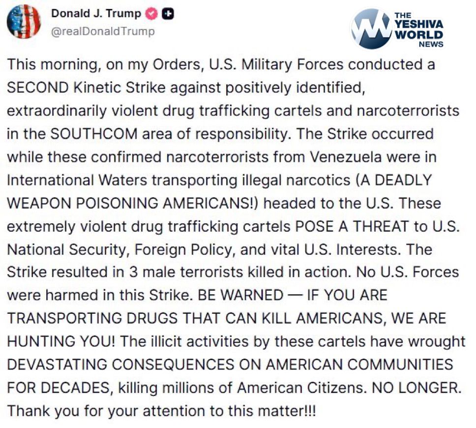 President Donald J. Trump announced that, under his orders, the U.S. military conducted a second strike today against a boat carrying narco-terrorists in the Southern Caribbean off Venezuela, killing three cartel members.