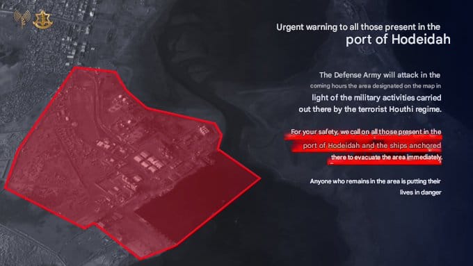 ⚠ The IDF has issued an immediate evacuation warning for the Houthi-controlled Hodeida port in western Yemen ahead of planned strikes. Residents and vessels at the port are urged to leave immediately.