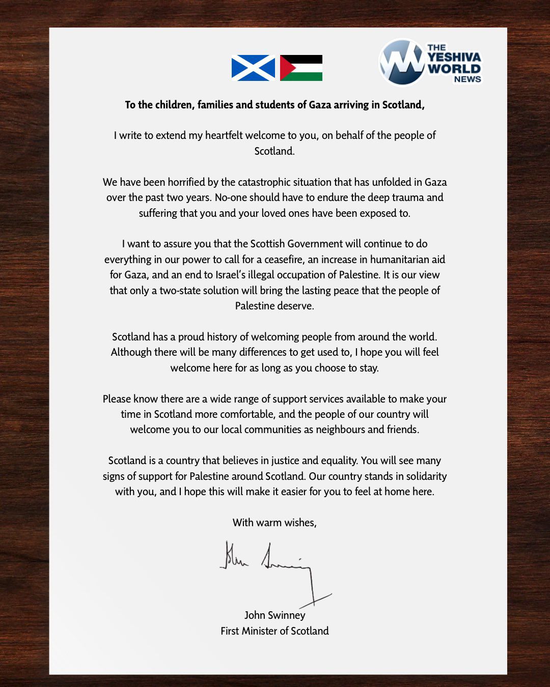 Scotland’s First Minister John Swinney welcomed children, students, and families from Gaza who arrived seeking medical care, affirming that “Scotland stands with the people of Palestine.”