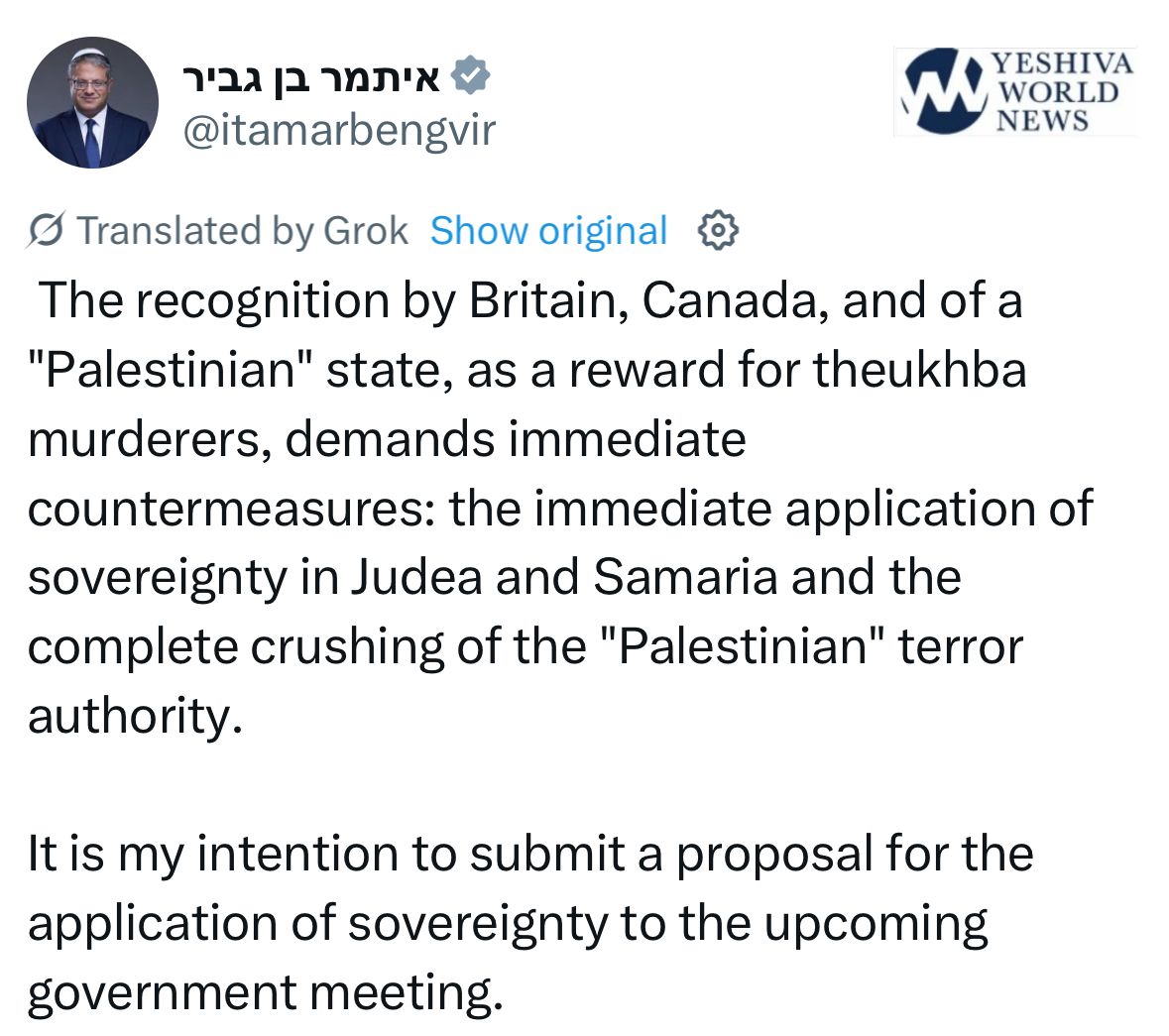 Israel Minster Ben Gvir: “The British, Canadian, and Australian recognition of a Palestinian state is a reward for Hamas.”