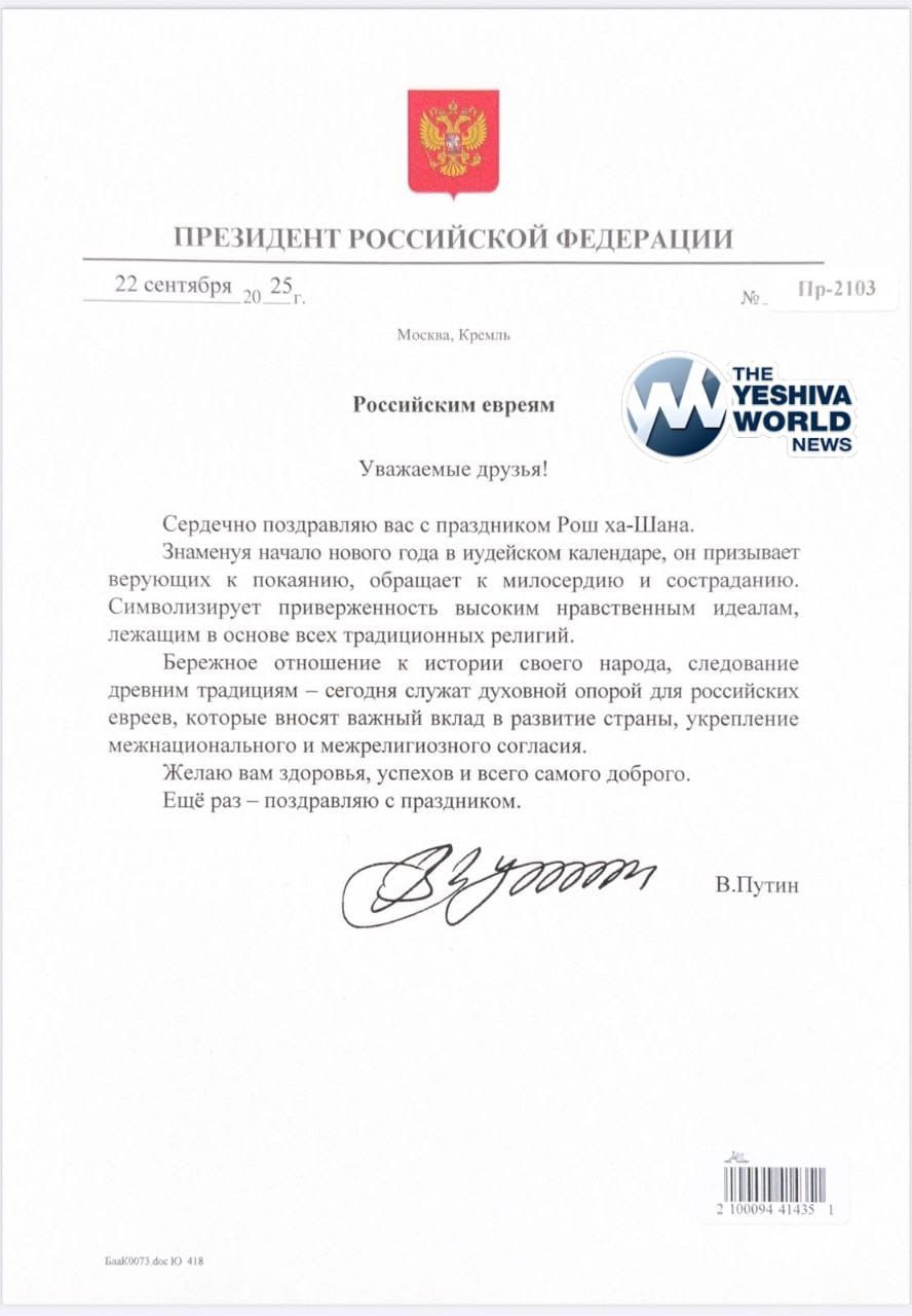 Russian President Vladimir Putin issued a special Rosh Hashanah message to the Jewish community, writing: “The Jewish people make an important contribution to the development of the country and to strengthening inter-ethnic and inter-religious harmony. I wish you health, success, and all the best.”