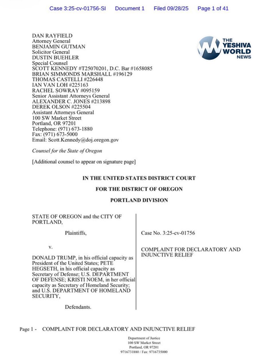 The State of Oregon and the City of Portland have filed an emergency injunction against Secretary of War Pete Hegseth’s order to forcibly federalize between 200 and 2,000 members of the Oregon National Guard, removing them from the governor’s authority.