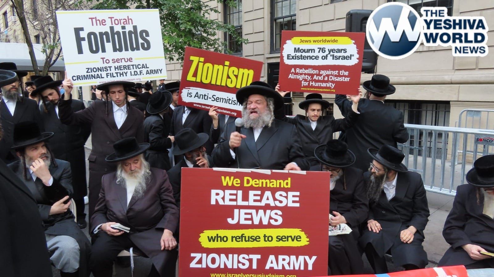 Neturei Karta protested on Monday morning outside the hotel where PM Netanyahu was staying in NYC, following arrests of Yeshiva Bochrim who refused to enlist in the IDF.
