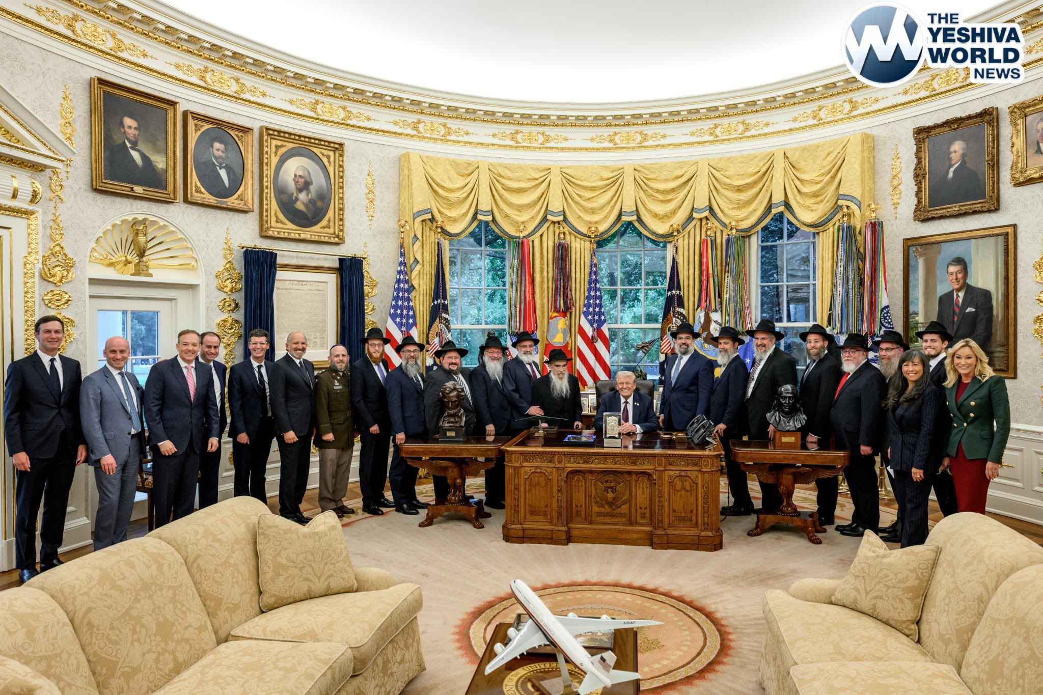 PHOTO: President Donald Trump and members of his cabinet hosted a delegation of 14 Chabad rabbis from across the U.S., led by Rabbi Levi Shemtov, in the Oval Office today. During the roughly 20-minute meeting, the rabbis presented the President with a silver tzedakah box in honor of Education and Sharing Day, a celebration established in tribute to the Lubavitcher Rebbe.