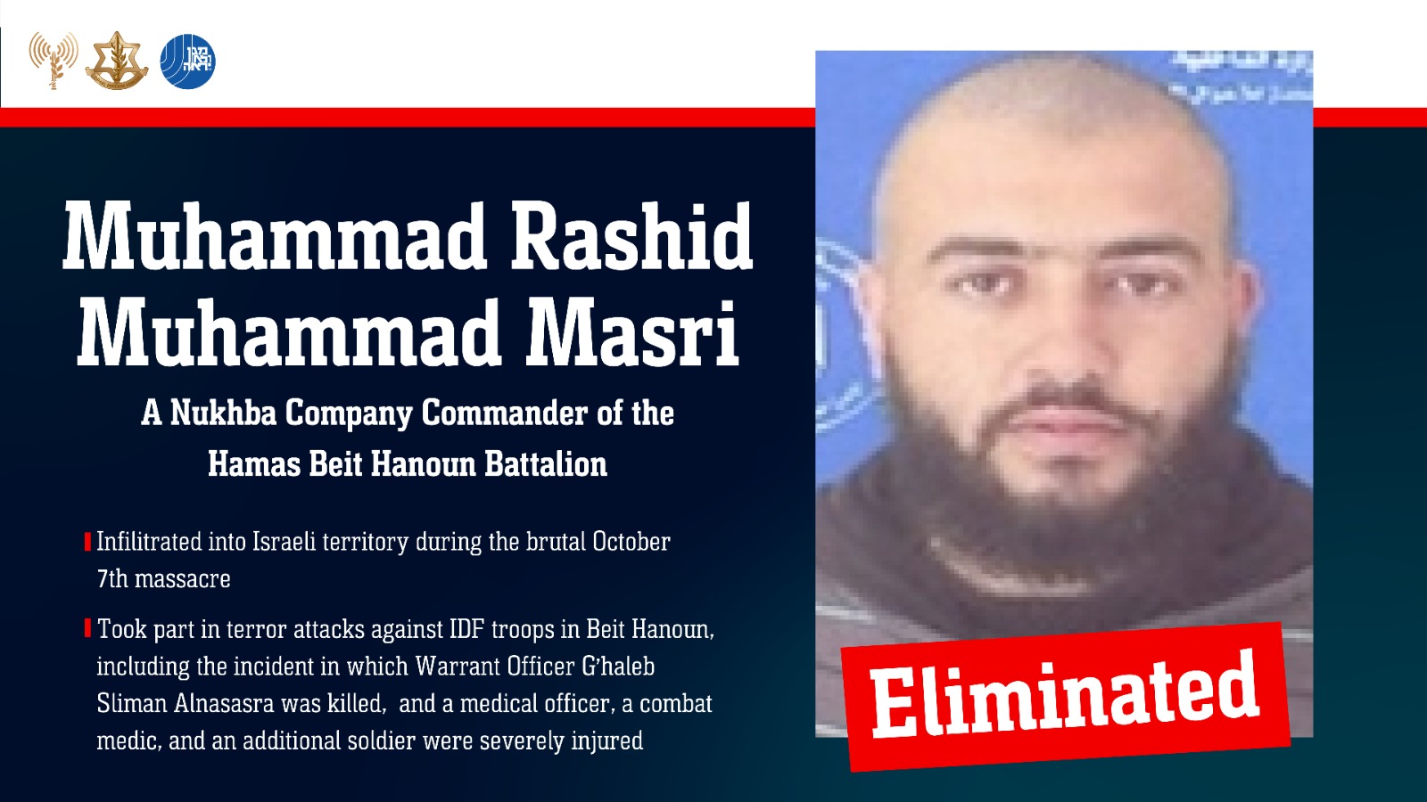IDF and Shin Bet forces have eliminated Muhammad Rashid Muhammad Masri, a Hamas Nukhba Company Commander in the Beit Hanoun Battalion.