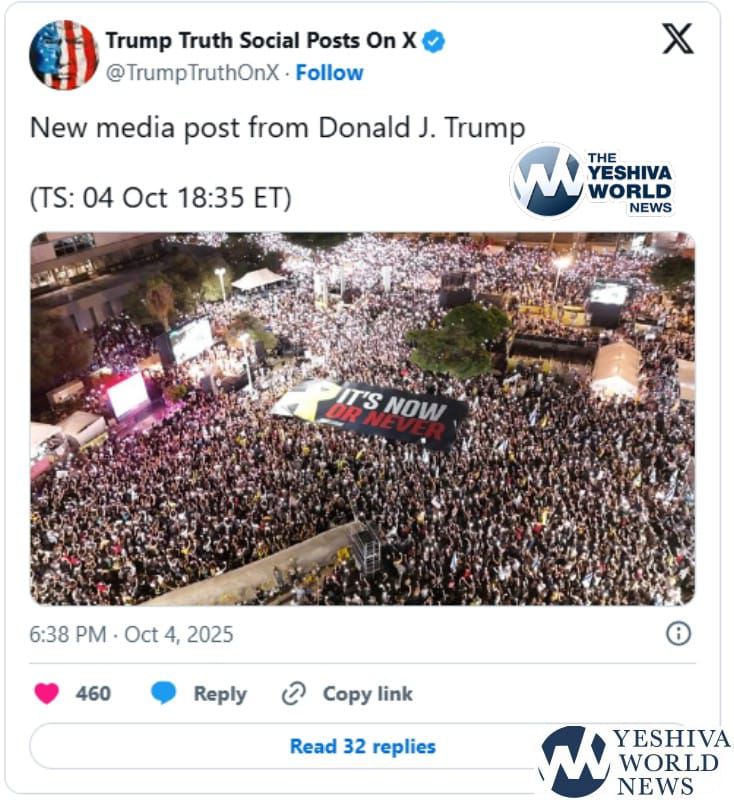 President Trump posts a photo from the rally earlier tonight at Hostages Square in Tel Aviv urging the government to close the deal he proposed for ending the Gaza war and returning all the hostages. The photo shows the crowd from above, holding a banner that reads: “It’s now or never.”