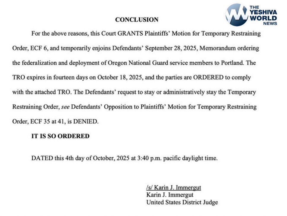 U.S. District Judge Karin J. Immergut, a 2018 Trump appointee, has issued a temporary restraining order preventing the Trump administration from federalizing and deploying the Oregon National Guard to Portland until at least October 18, 2025.