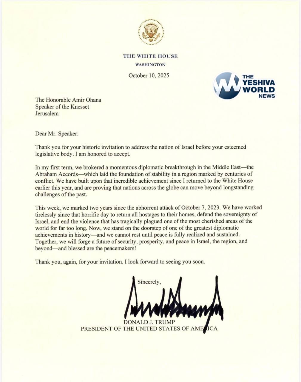 President Trump thanked the Knesset for the invitation, highlighting his dedication to promoting security, prosperity, and peace in Israel and the region, while building on the Abraham Accords and recent diplomatic initiatives.