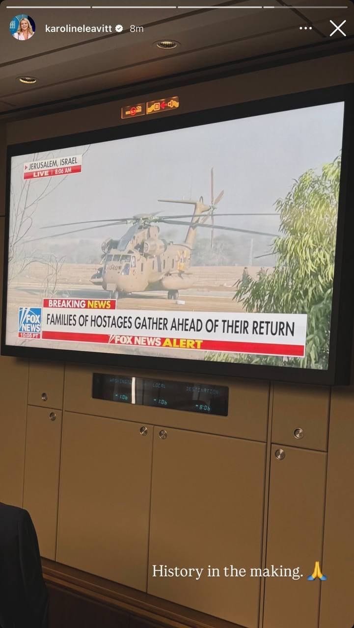 White House Press Secretary Karoline Leavitt shares footage of the hostage release being aired live on Air Force One as President Trump begins his descent into Israel