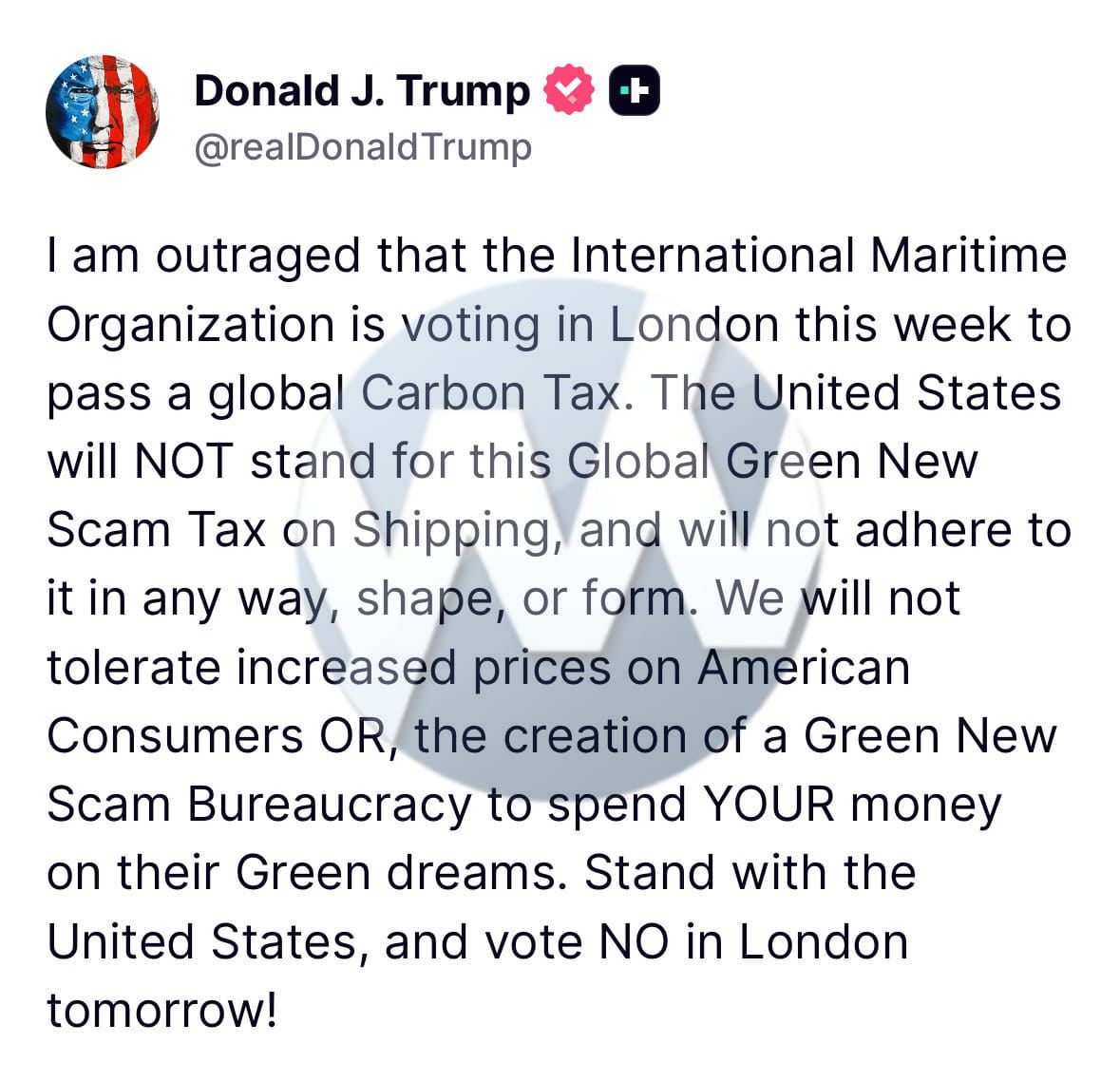 TRUMP: “I Am Outraged IMO Is Voting on Global Carbon Tax in London”