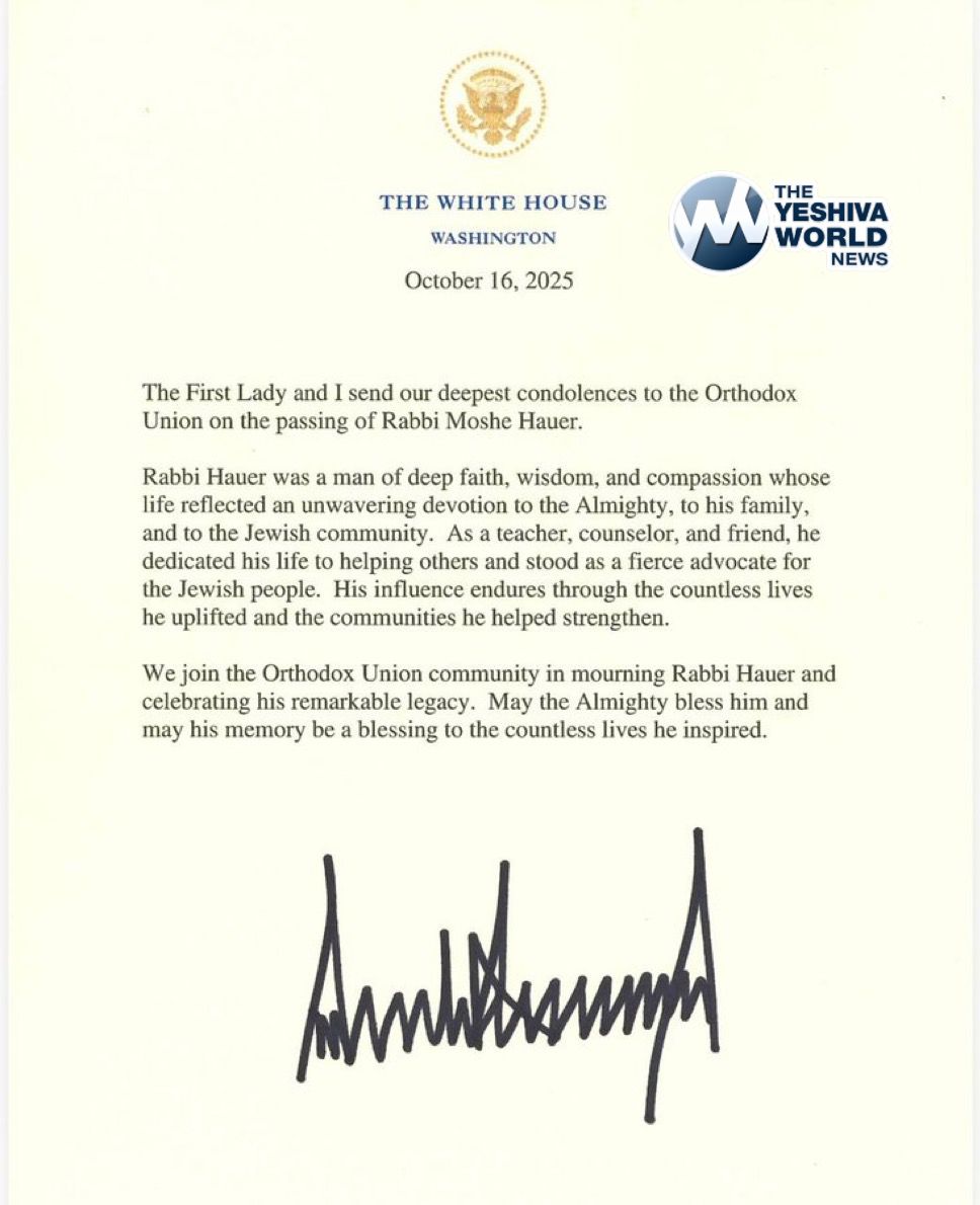 President Trump expressed his condolences for the sudden passing of Rabbi Moshe Hauer, CEO of the Orthodox Union (OU), who died unexpectedly on Shemini Atzeres at age 60.