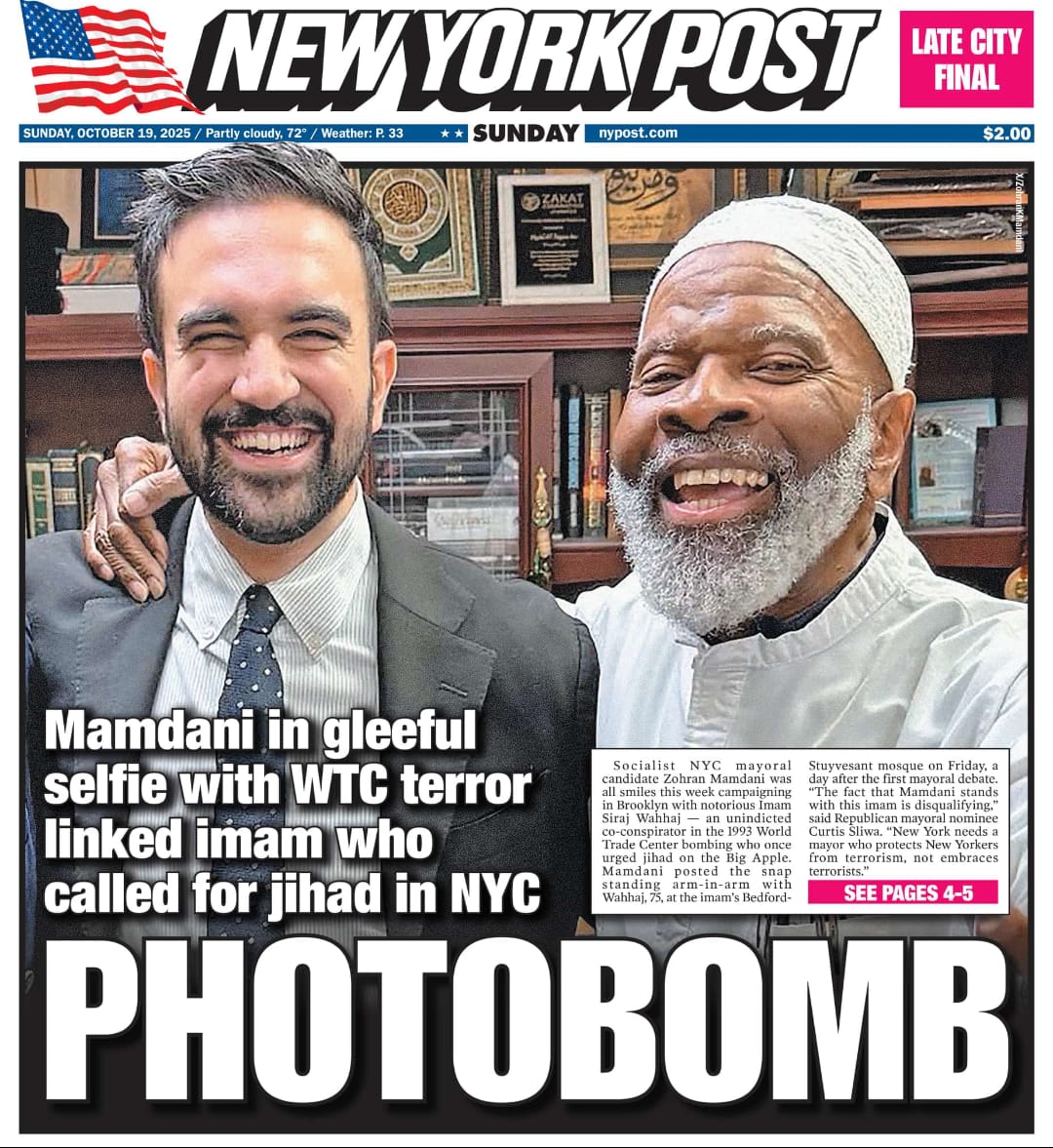 Brutal front page from the NY Post after NYC mayoral frontrunner Zohran Mamdani was photographed campaigning with an imam who is an unindicted co-conspirator of the 1993 World Trade Center bombing and who has called for “jihad” in American cities.