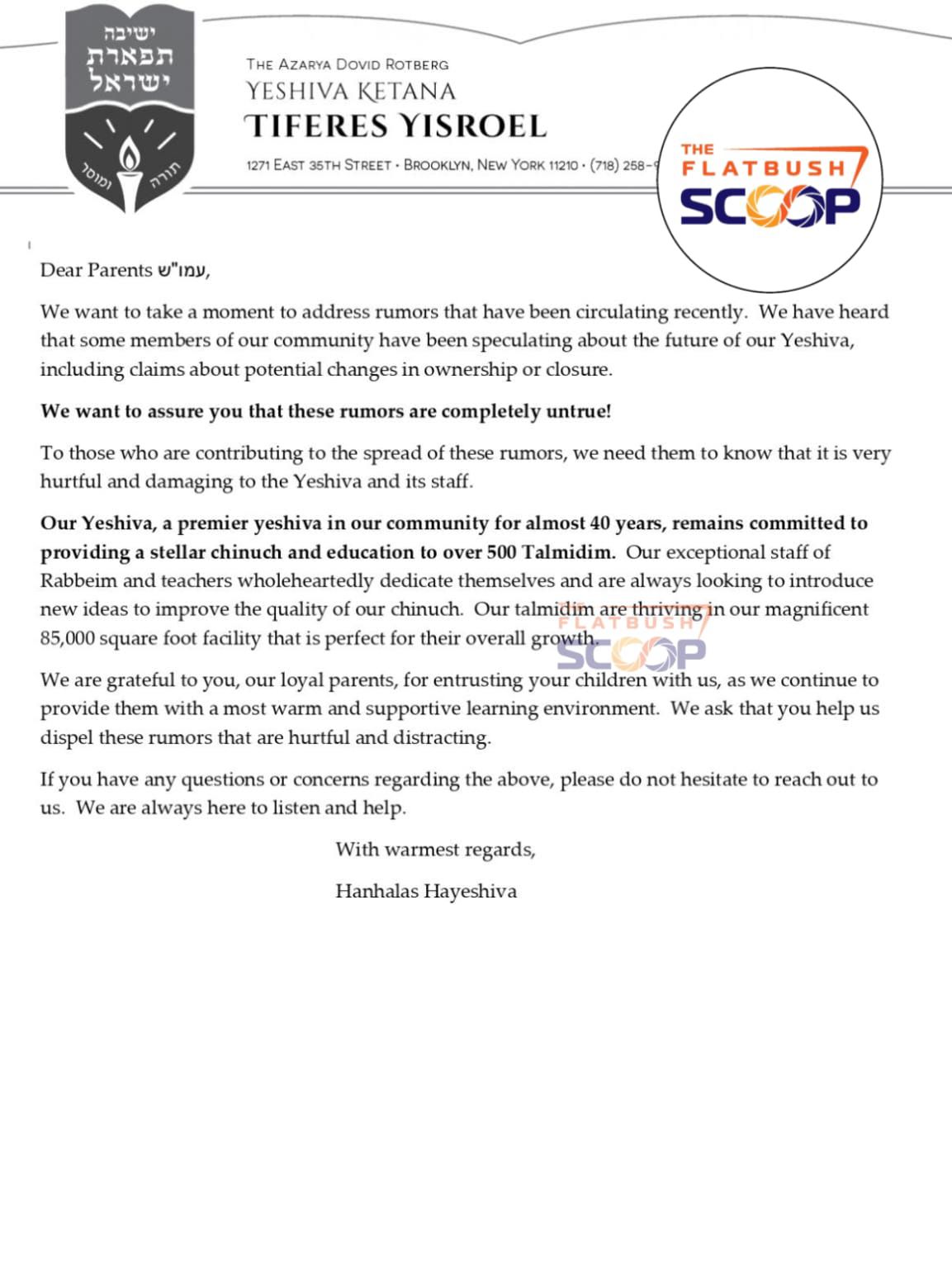 Yeshiva Tiferes Yisroel (Chofetz Chaim) on East 35 Street in Flatbush released the attached statement tonight. Sources tell Flatbush Scoop that a rumor has recently spread that the Yeshiva was being sold or closing. Those rumors are not true.