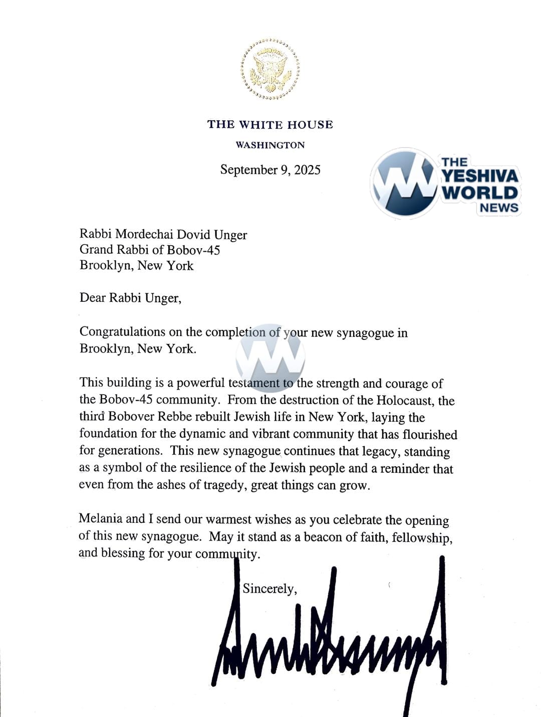 🔥 President Trump sent a heartfelt letter to the Bobov-45 Rebbe, congratulating him and the community on the completion of their new Bais Hamedrash in Boro Park. Personally delivered by Rabbi David Katz, a close friend of the president, the letter—received during Chol Hamoed and recently made public—praises the community’s resilience, calling the building “a powerful testament to the strength and courage” of Bobov-45 and a symbol that “even from the ashes of tragedy, great things can grow.” The president also paid tribute to the Rebbe’s grandfather, the Bobover Rebbe zt”l, for rebuilding Jewish life after the Holocaust.