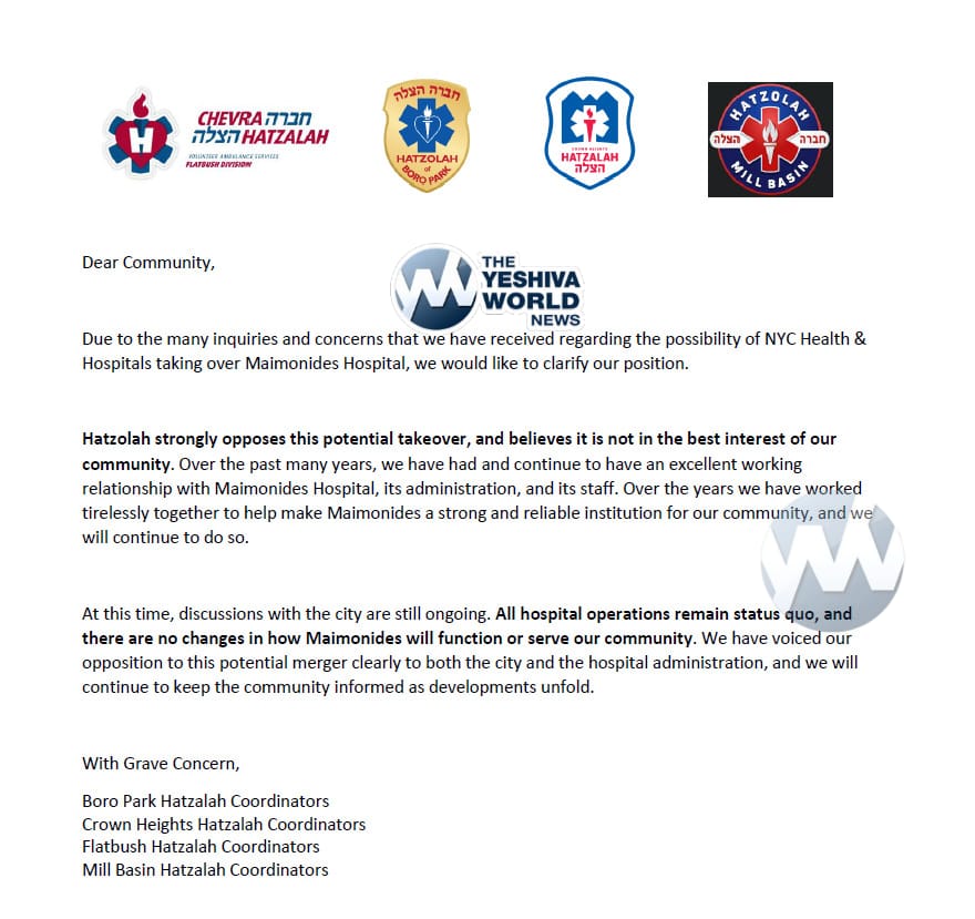 In a rare and strongly worded letter, Boro Park, Crown Heights, Flatbush, and Mill Basin Hatzolah Coordinators voiced grave concern over the potential NYC Health + Hospitals takeover of Maimonides Hospital.