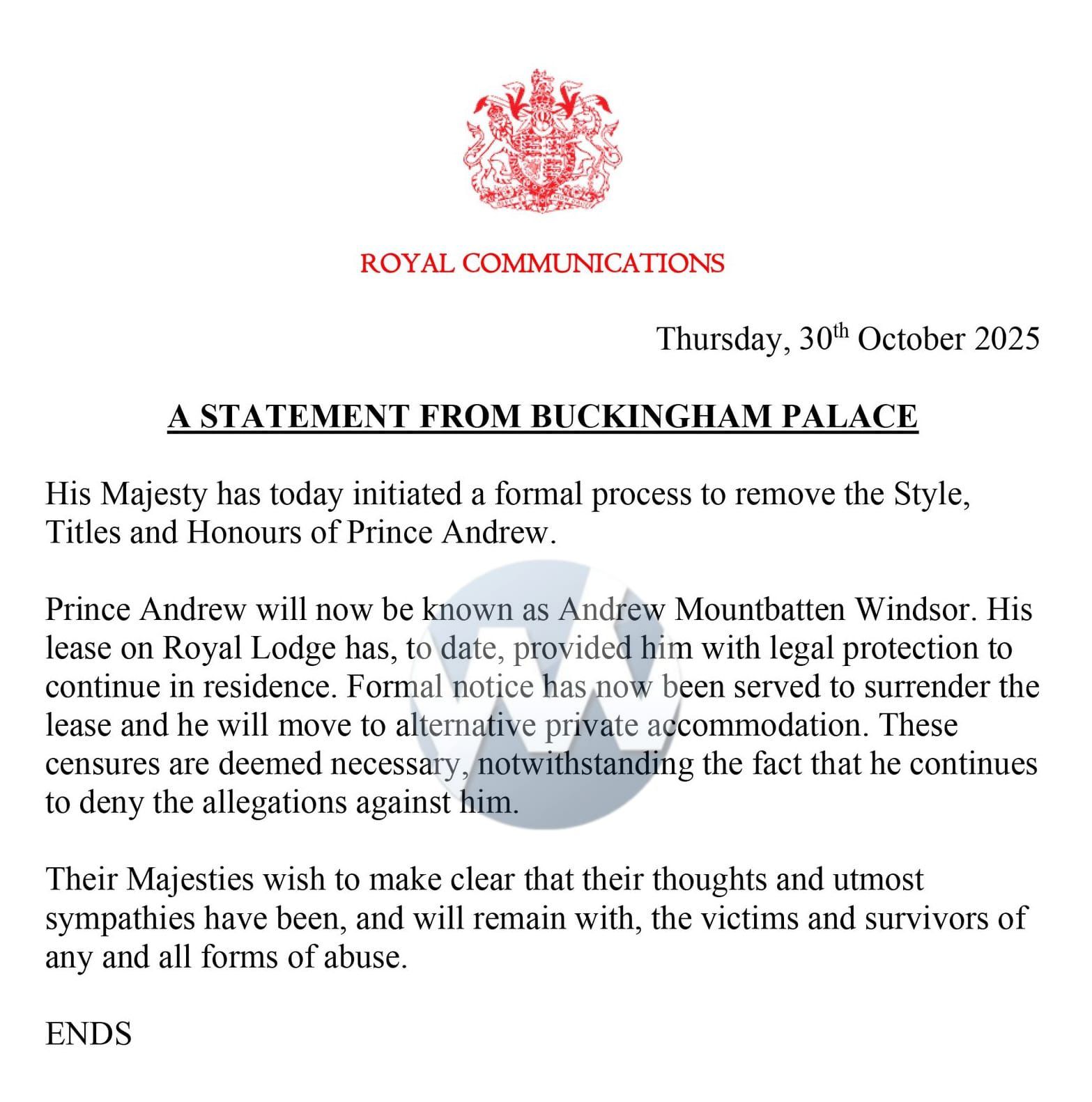BREAKING: Prince Andrew stripped of all royal titles and evicted from Windsor mansion, palace says.