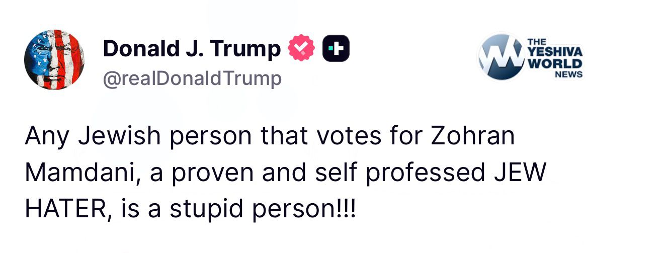 🚨 TRUMP: Any Jewish person who votes for Mamdani – a JEW HATER – is a stupid person!
