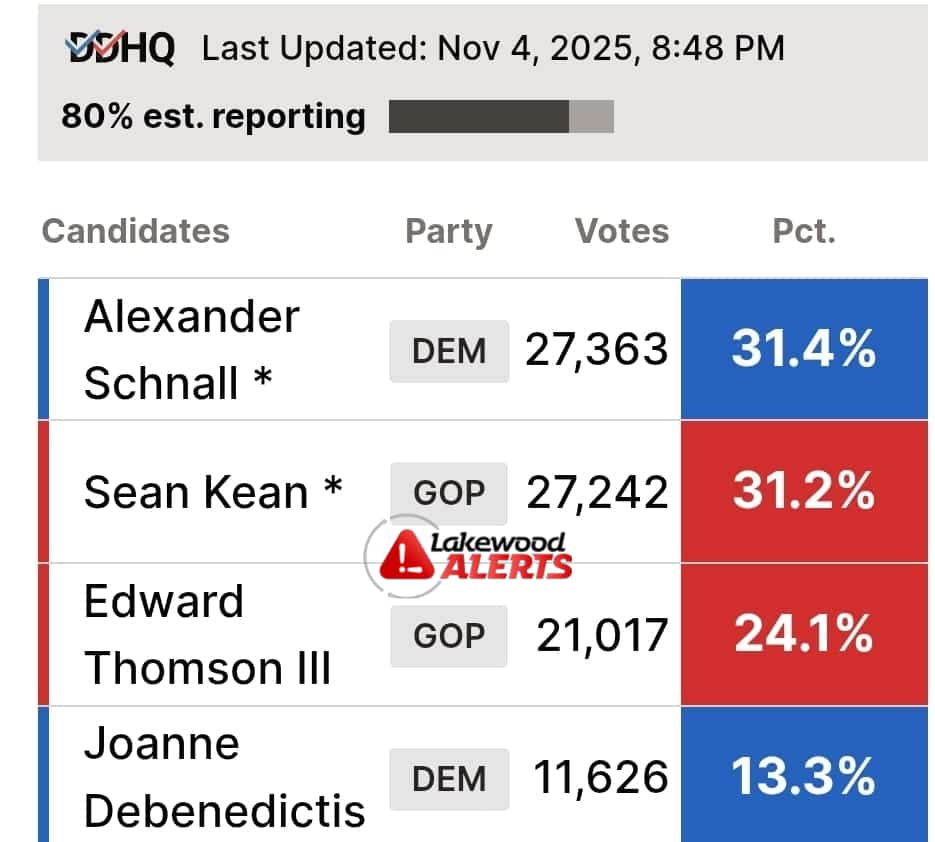 With 80% votes now counted Assemblyman Avi Schnall and Assemblyman Kean remain in the lead though the race has not been called yet.