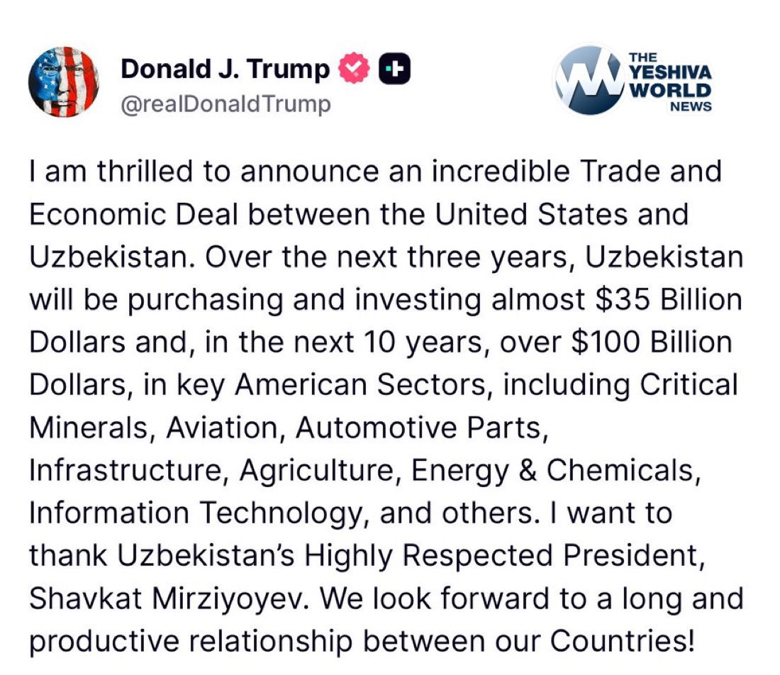 President Trump announces a massive trade and economic deal between the United States and Uzbekistan, including critical minerals, aviation, automotive parts, infrastructure, agriculture, energy and chemicals, information, technology, and others.