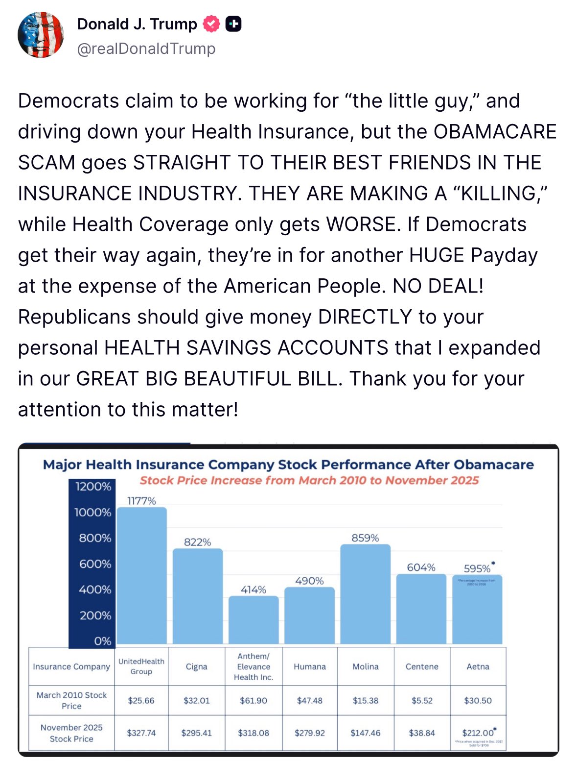 President Trump accuses Democrats of enriching insurance giants under Obamacare while ordinary Americans struggle with rising premiums and shrinking coverage – pointing to data showing health insurance stocks have skyrocketed since the Affordable Care Act became law — with UnitedHealth up +1,177%, Cigna +822%, and Humana +490% since 2010.