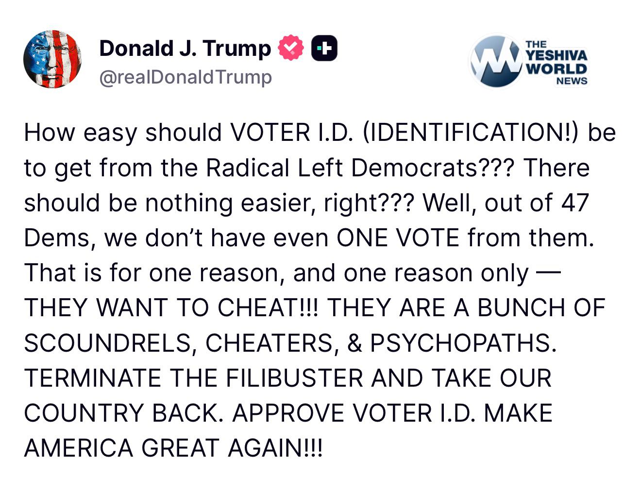 TRUMP: “How easy should VOTER I.D. be to get from the Radical Left Democrats??? TERMINATE THE FILIBUSTER AND TAKE OUR COUNTRY BACK. APPROVE VOTER I.D.”