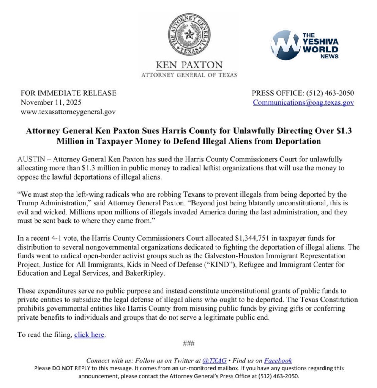 Texas AG Ken Paxton is suing Harris County for allegedly illegally using over $1.3 million in taxpayer funds to defend criminal illegals from deportation.