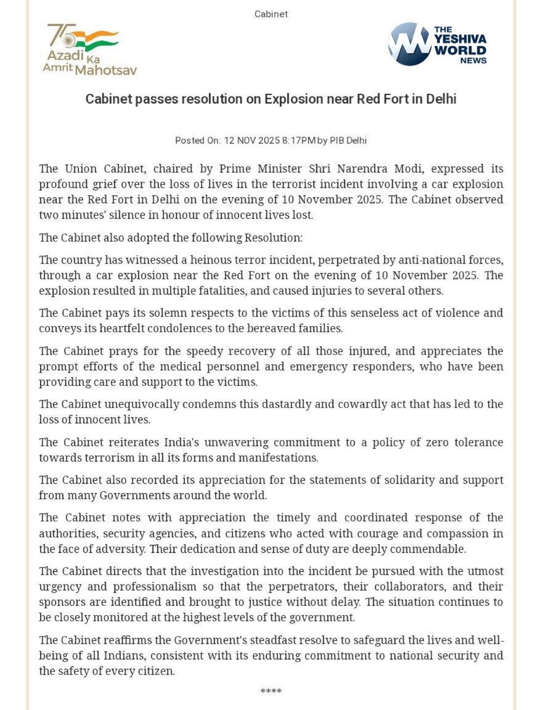 India’s cabinet has officially declared the Delhi Red Fort explosion a “terror incident.”