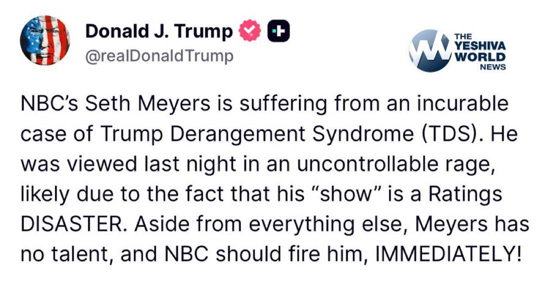 President Trump says Seth Meyers is suffering from an incurable case of TDS (Trump Derangement Syndrome)
