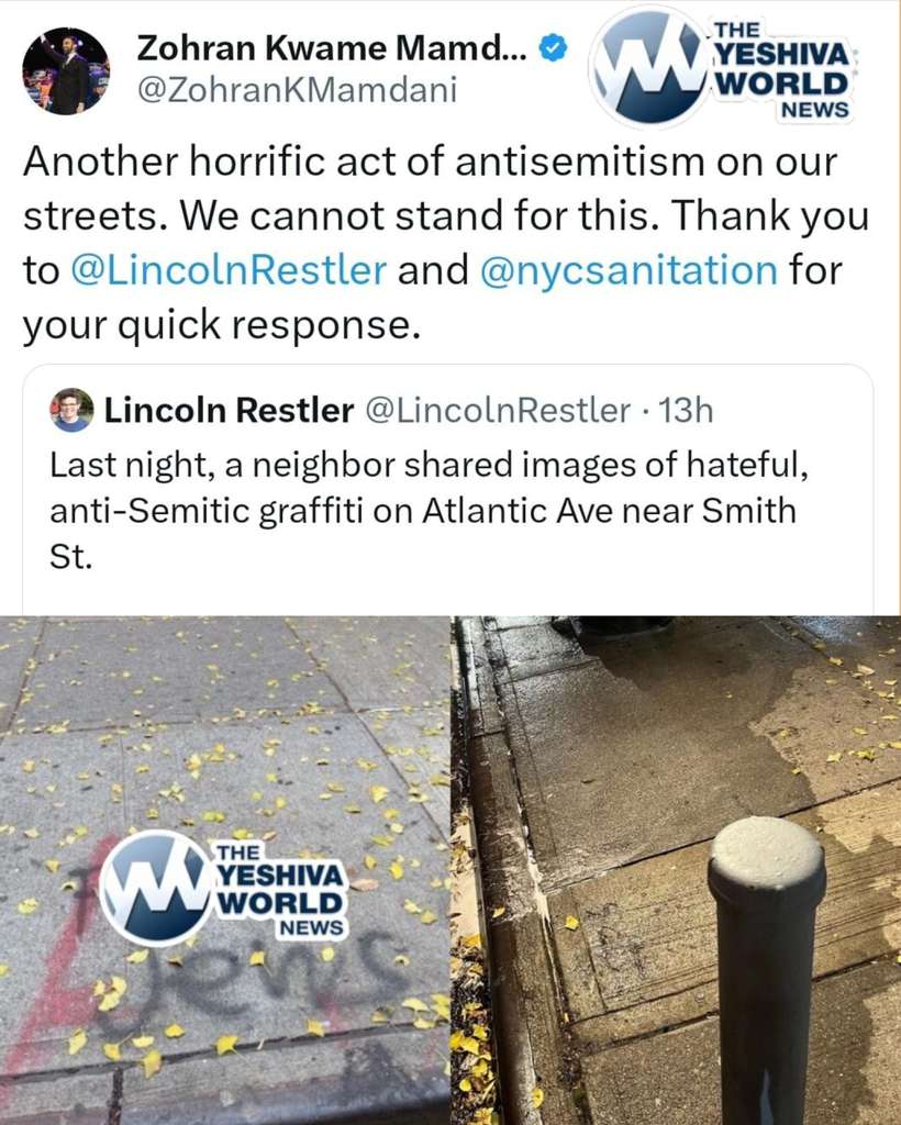 A hateful antisemitic message spray-painted on a Brooklyn sidewalk late Friday has drawn condemnation from New York City officials, including newly elected Mayor Zohran Mamdani, whose victory earlier this month came amid deep concern from Jewish leaders about rising antisemitism across the city.