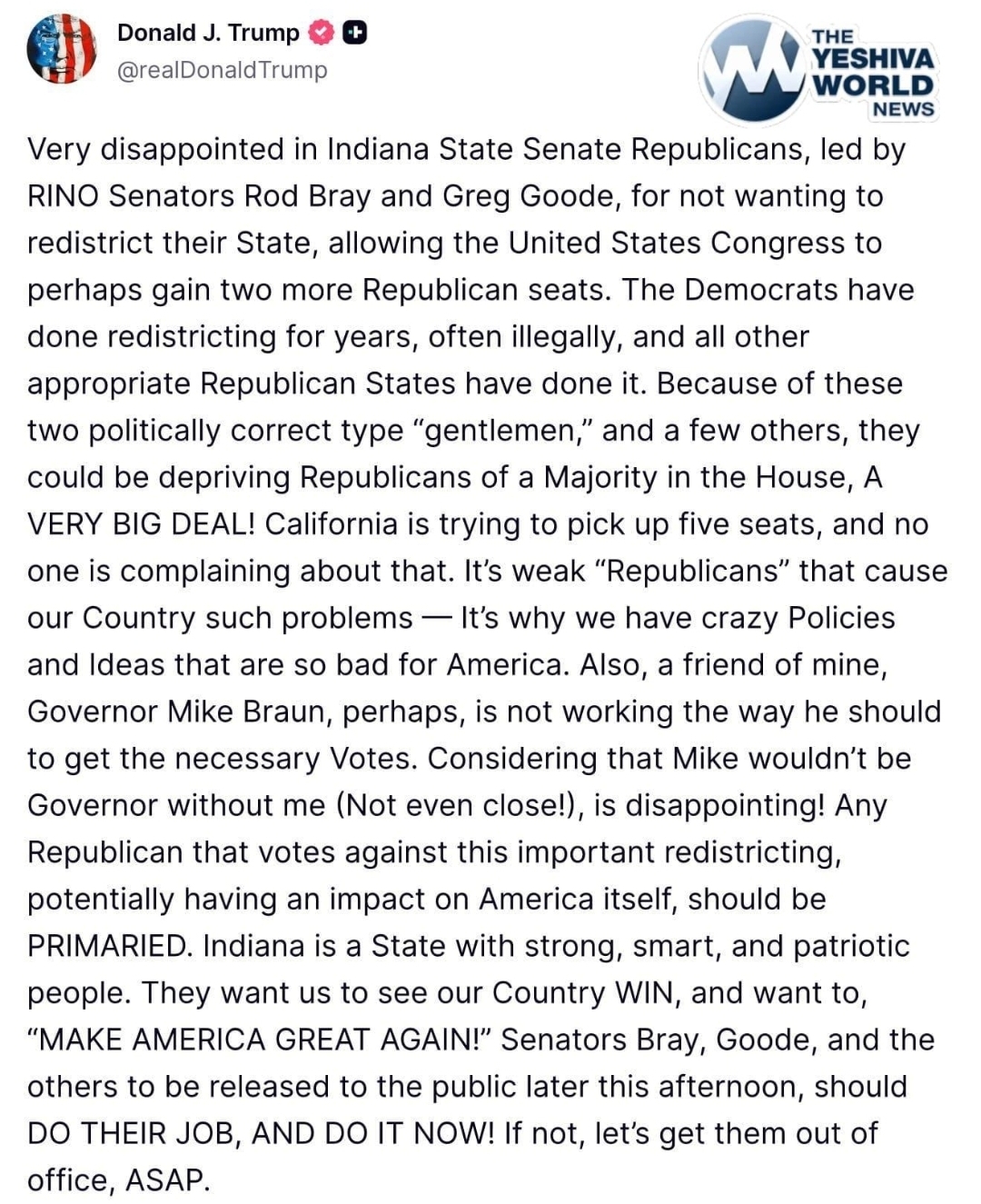 President Trump confirms primary challenges to any Indiana GOP state senator who caved to Gavin Newsom and refused to redistrict the 2026 House map, potentially forfeiting a pickup of two Republican seats.