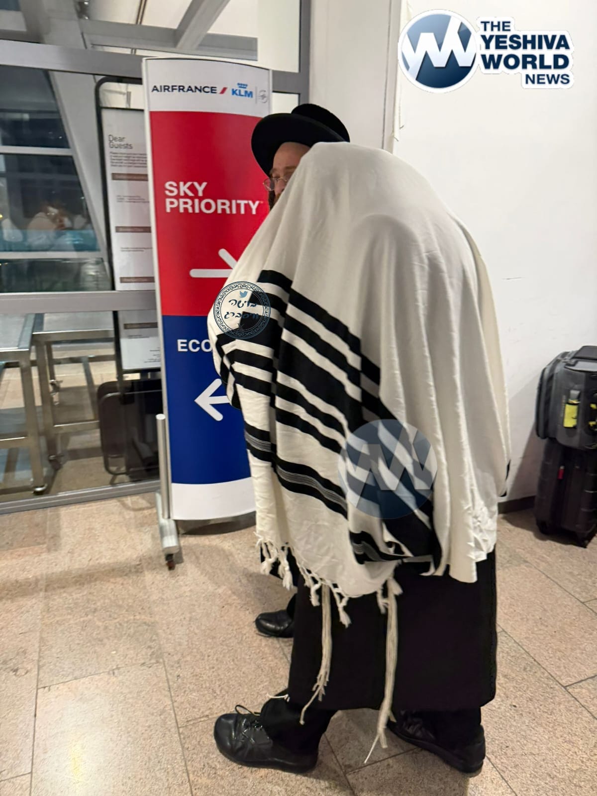 HaRav Tzvi Meir Zilberberg, was seen on his way to a flight from Israel to the United States enveloped in his tallis to safeguard his eyes.