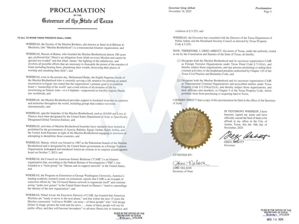 Texas Governor Greg Abbott has labeled the Muslim Brotherhood and CAIR as foreign terrorist and transnational criminal organizations, banning them from acquiring land in Texas and empowering the Attorney General to take legal action to shut them down.