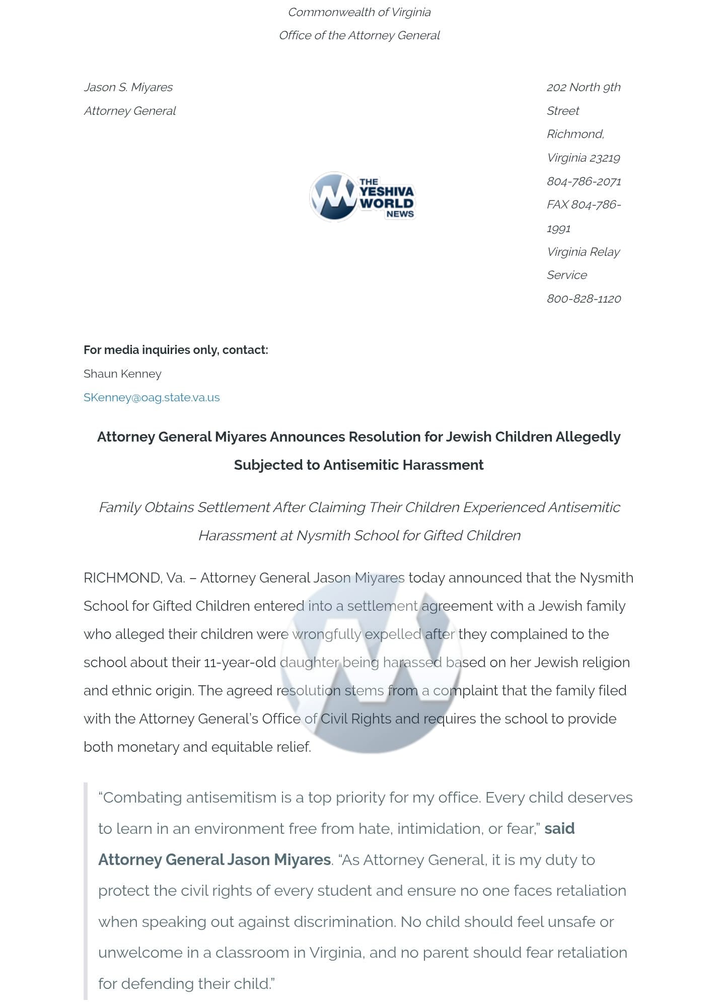 Virginia Attorney General Jason Miyares said the agreement addresses the family’s claims and strengthens protections for Jewish students, with reforms designed to prevent future incidents and ensure accountability.