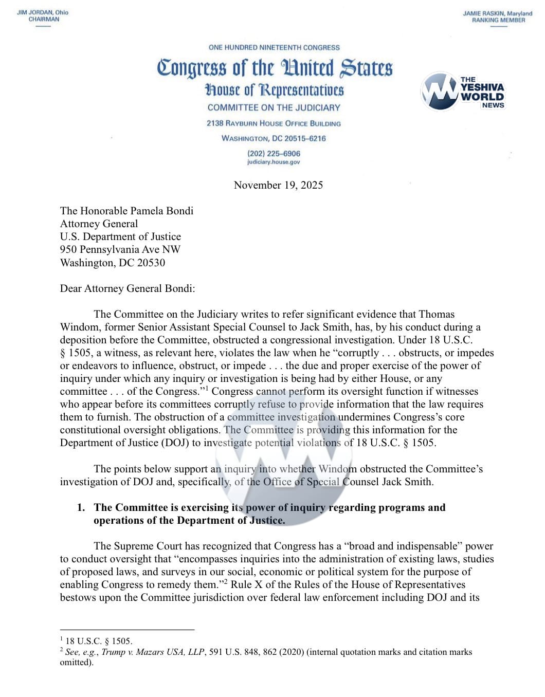 BREAKING: House Judiciary Committee Chairman Jim Jordan has referred former special-counsel deputy Thomas Windom to the Department of Justice for potential criminal prosecution, accusing him of obstructing a congressional investigation by refusing to answer questions about his work on the Jack Smith probe.