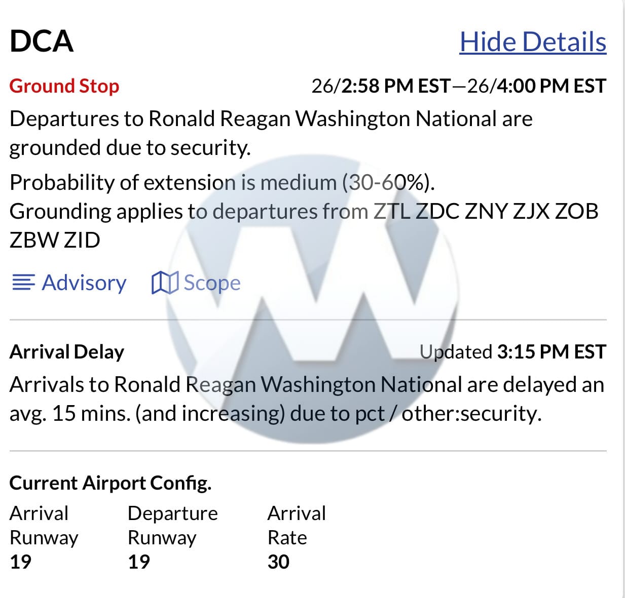 Ground stop ordered at Ronald Reagan Washington National Airport (DCA) for security reasons.