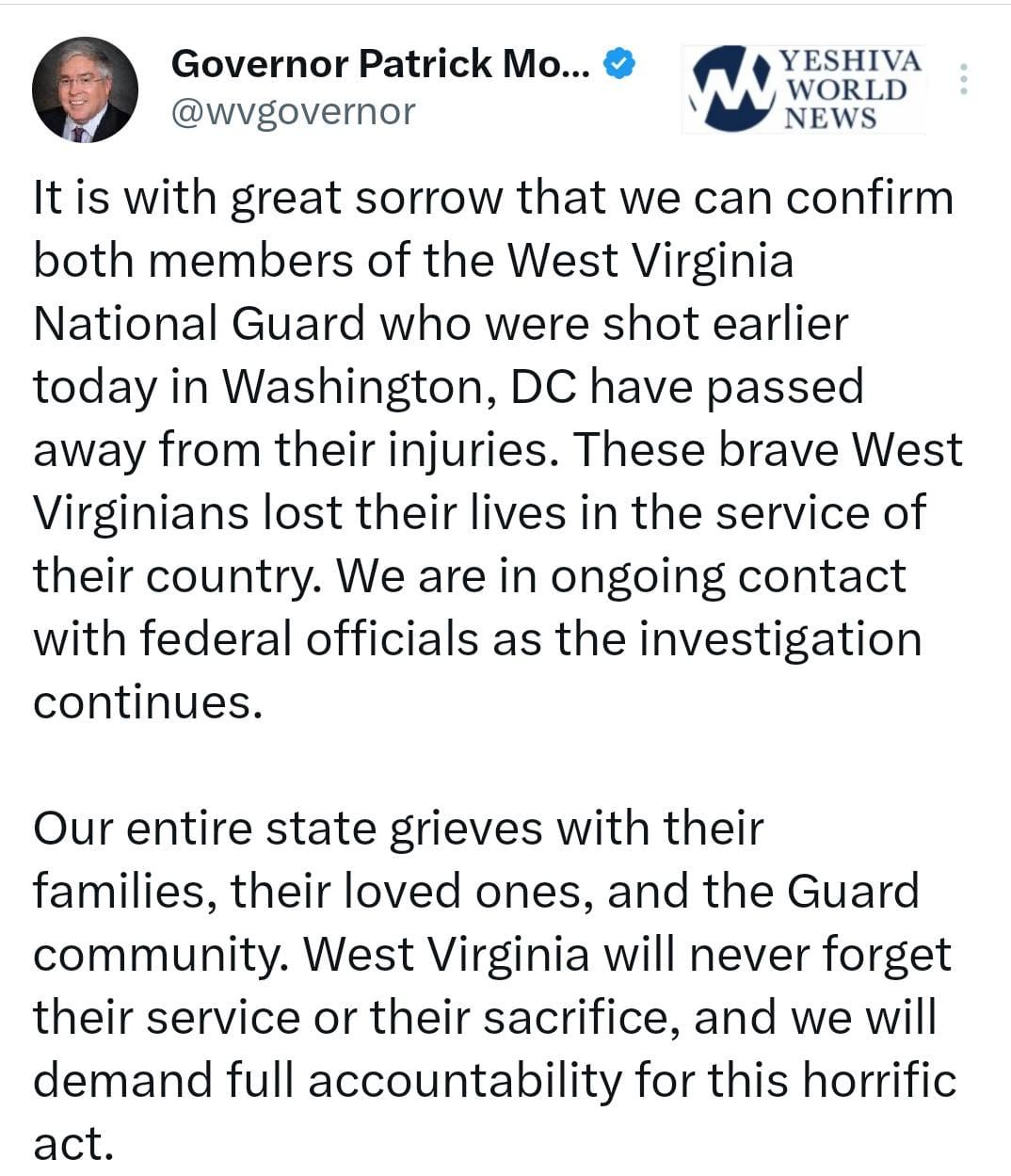 BREAKING: West Virginia Gov. Patrick Morrissey says two members of his state’s National Guard have passed away after being shot in Washington, D.C., just blocks away from the White House.