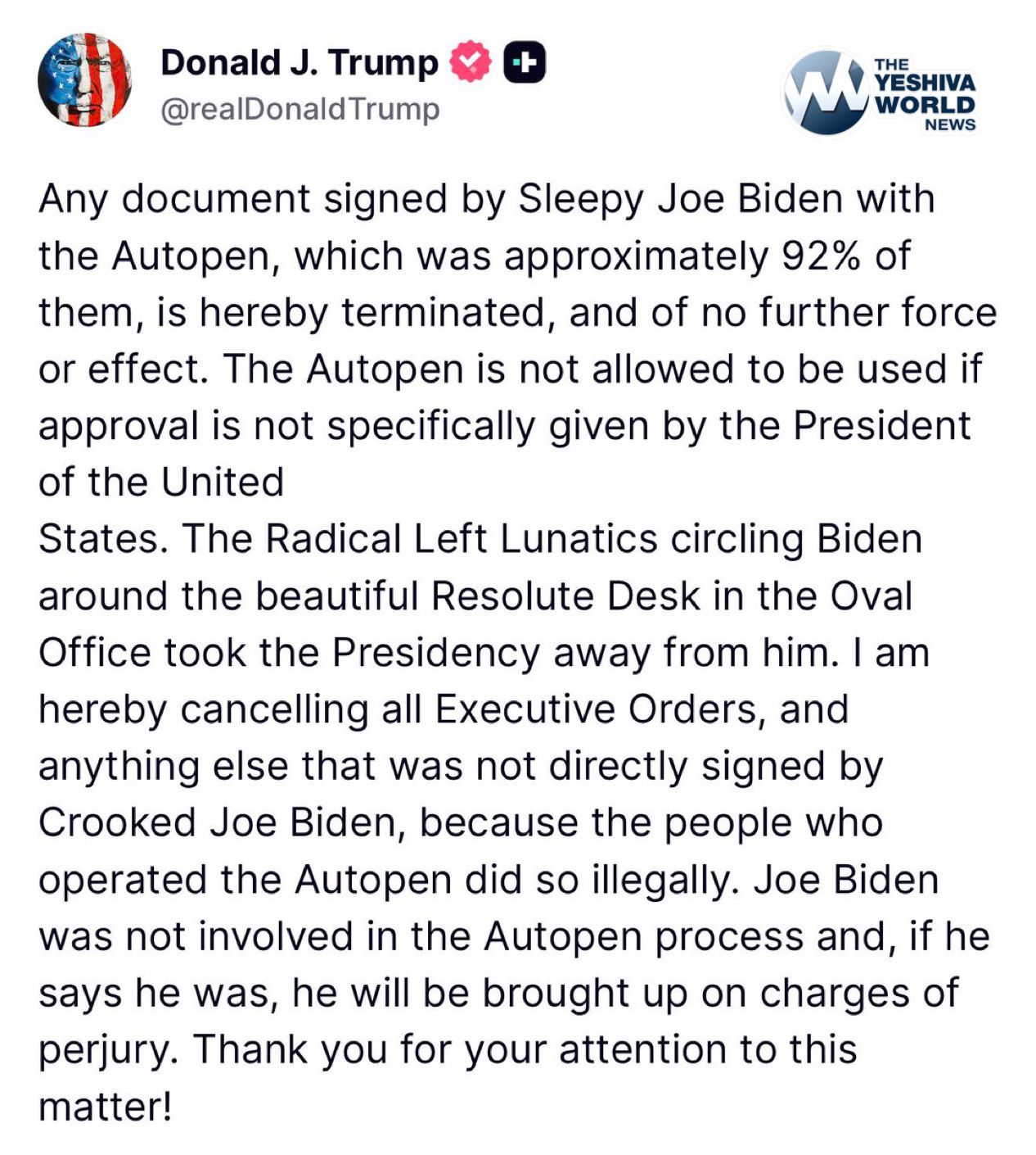 🚨 TRUMP: “Any document signed by sleepy Joe Biden with the autopen, which was approximately 92% of them, is hereby terminated”