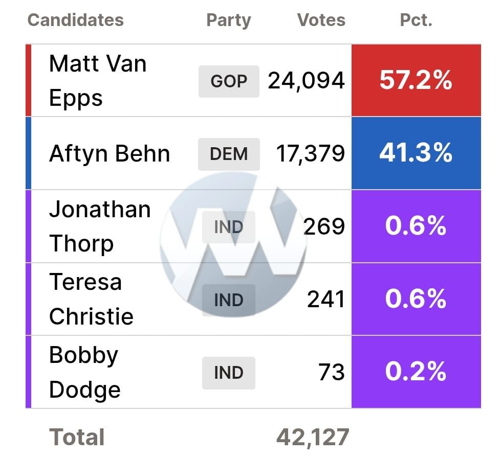 With 27% reporting, Trump-endorsed Republican Matt Van Epps leads with 57.2% (24,094 votes).