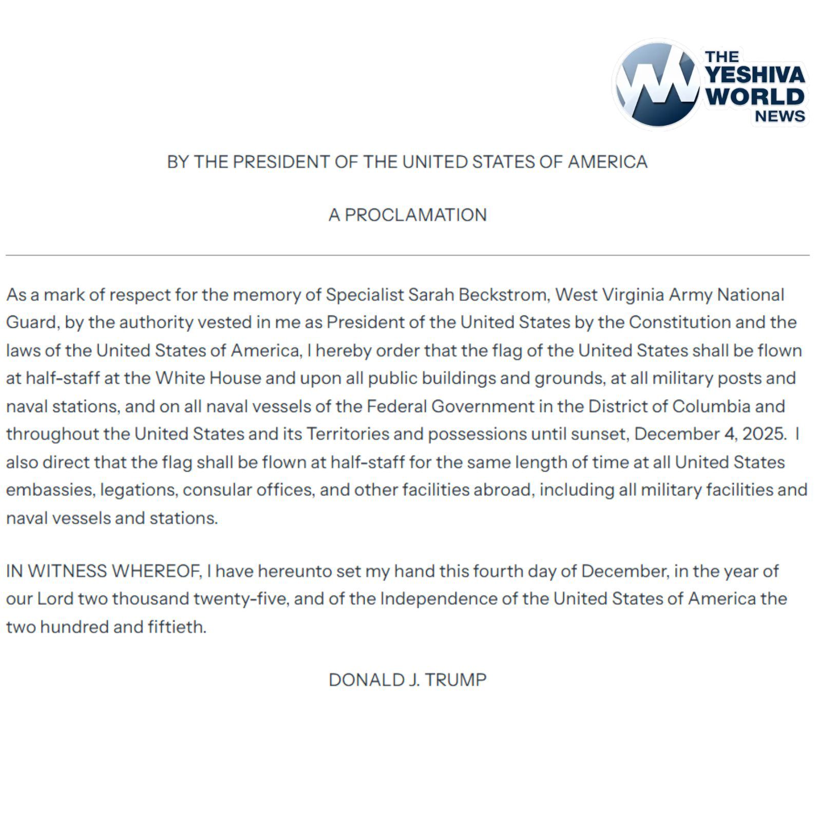 President Trump orders U.S. flags at half-staff to honor Army Specialist Sarah Beckstrom, a West Virginia National Guard member killed by an Afghan in Washington, D.C.