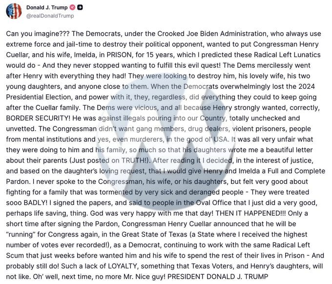 Trump blasts Rep. Henry Cuellar for immediately running for re-election as a Democrat after Trump pardoned him –