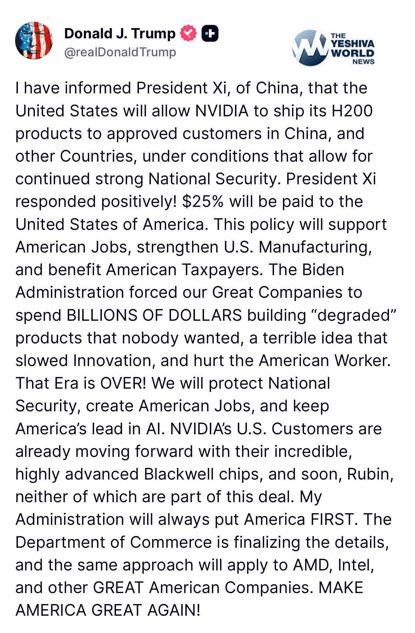 President Trump tells Chinese President Xi that the U.S. will approve shipments of NVIDIA H200 products to select customers in China.