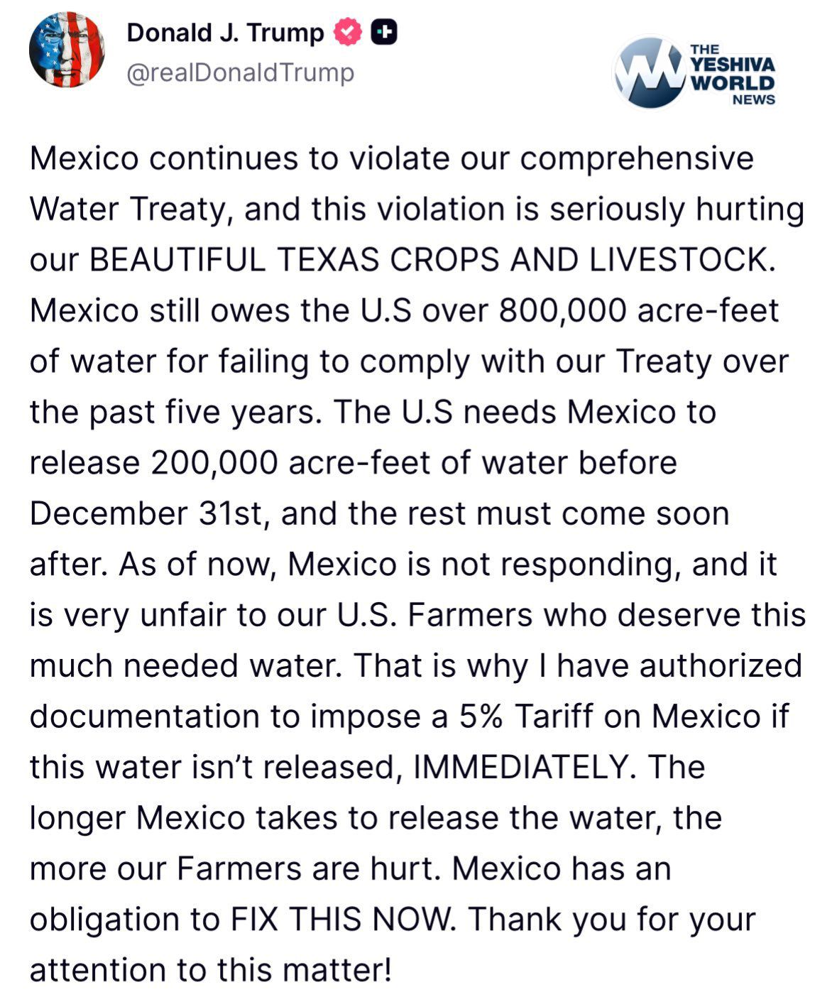 TRUMP: “Mexico still owes the U.S over 800,000 acre-feet of water for failing to comply with our Treaty over the past five years. The U.S needs Mexico to release 200,000 acre-feet of water before December 31st, and the rest must come soon after.”