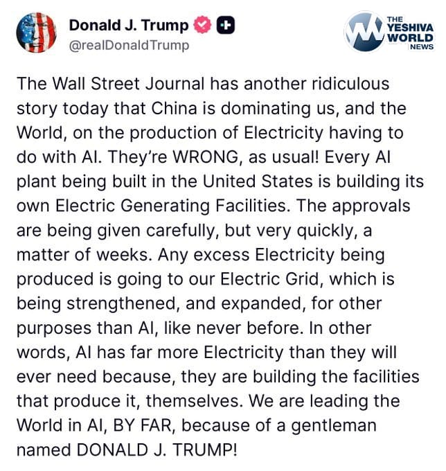 President Trump pushed back against a Wall Street Journal report, calling it “ridiculous” and saying claims that China is dominating the U.S. and the world in electricity production tied to AI are “wrong.”