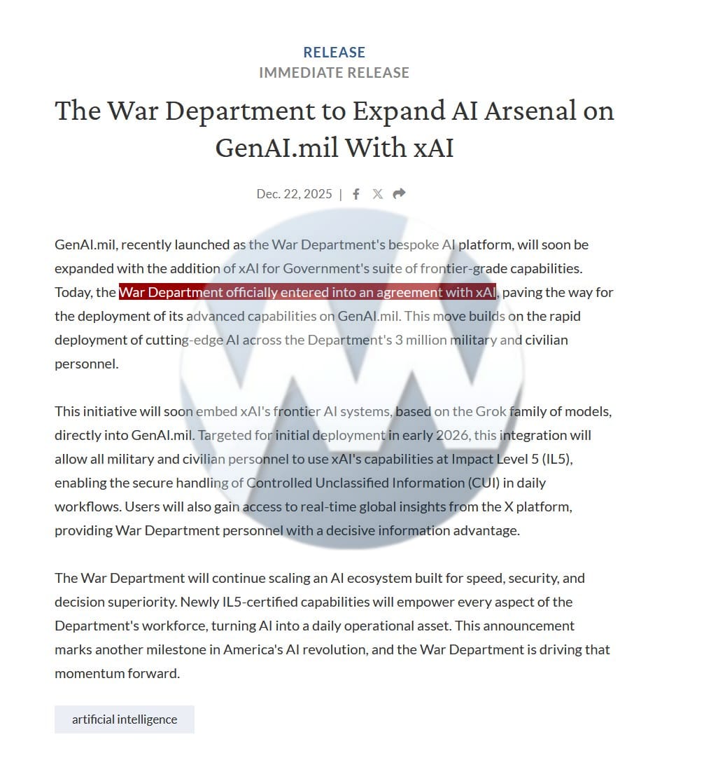 U.S. Pentagon officially enters into an agreement with xAI, building on the “rapid deployment of cutting‑edge AI across the Department’s 3 million military and civilian personnel.