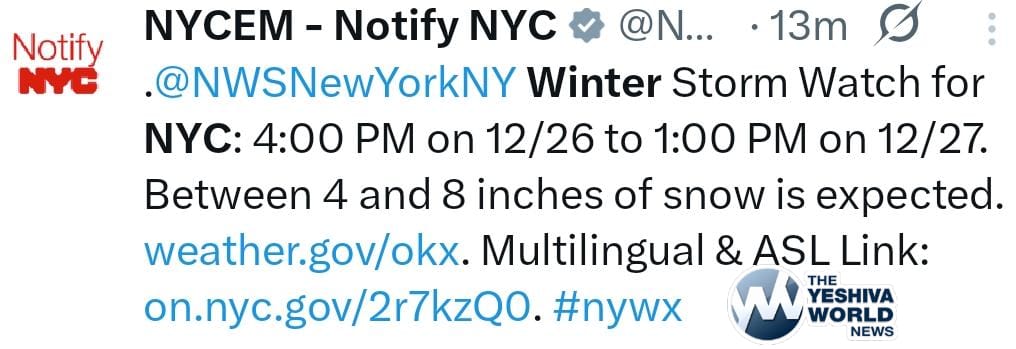 New York City Emergency Management: A Winter Storm Watch is in effect for New York City from 4:00 PM on December 26 through 1:00 PM on December 27, with 4–8 inches of snow expected across the city.
