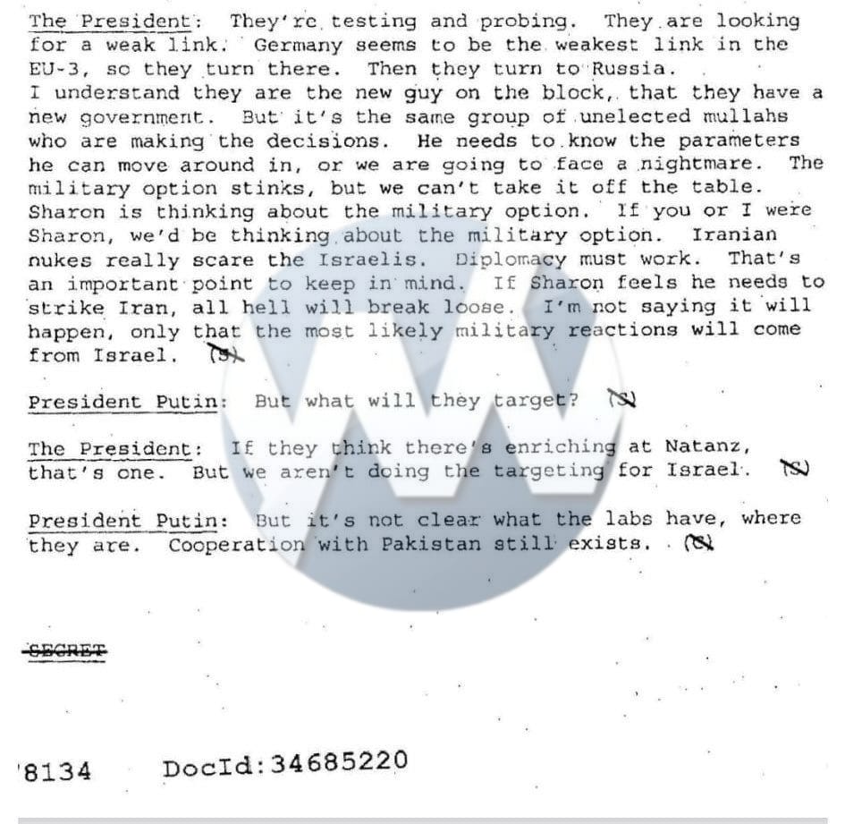 Newly released U.S. documents reveal a 2005 Oval Office exchange between Vladimir Putin and former U.S. President George W. Bush about Iran and the possibility of an Israeli strike on Iran.