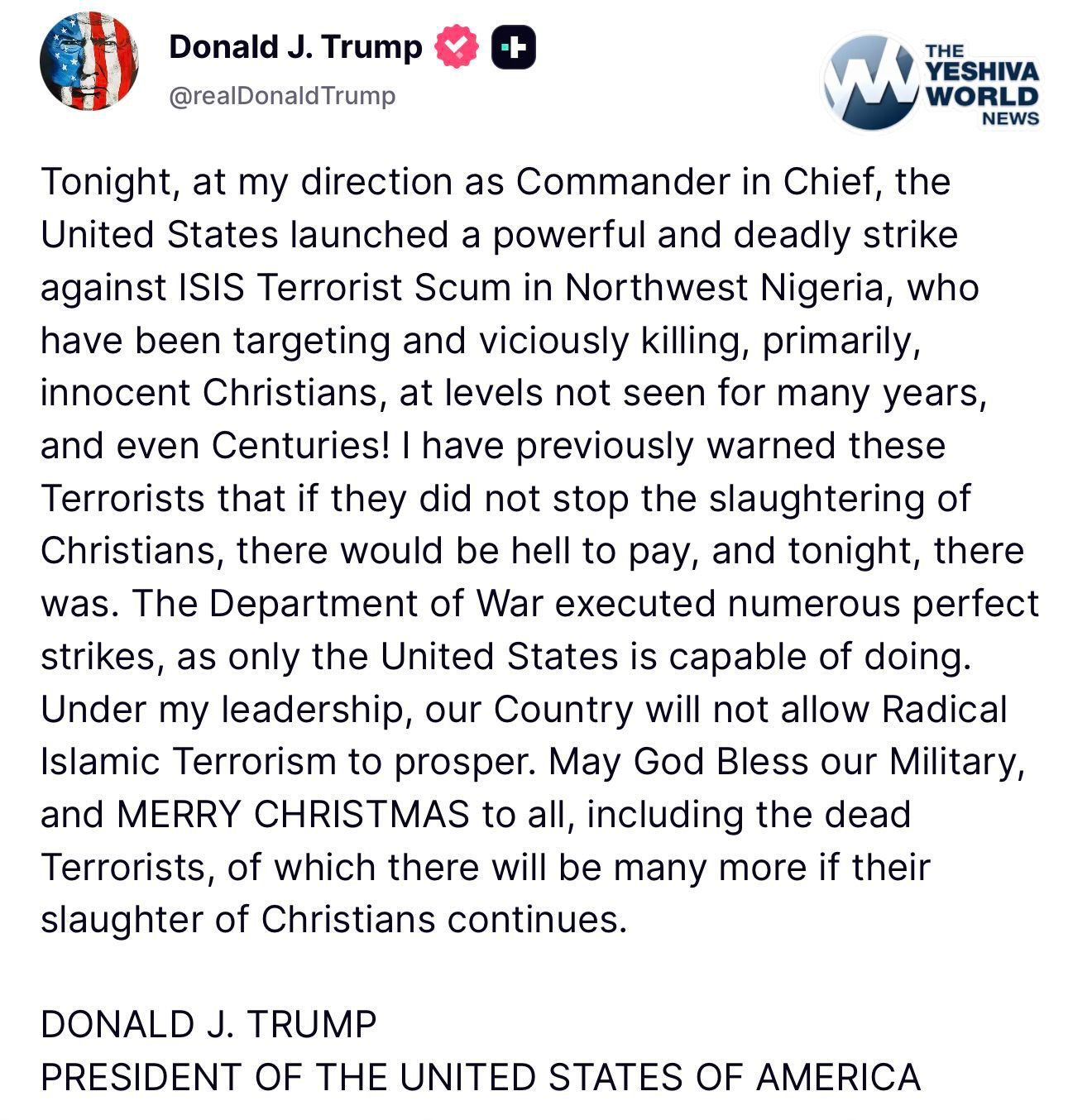 Trump: Tonight, at my direction as Commander in Chief, the United States launched a powerful and deadly strike against ISIS Terrorist Scum in Northwest Nigeria, who have been targeting and viciously killing, primarily, innocent Christians, at levels not seen for many years, and even Centuries!