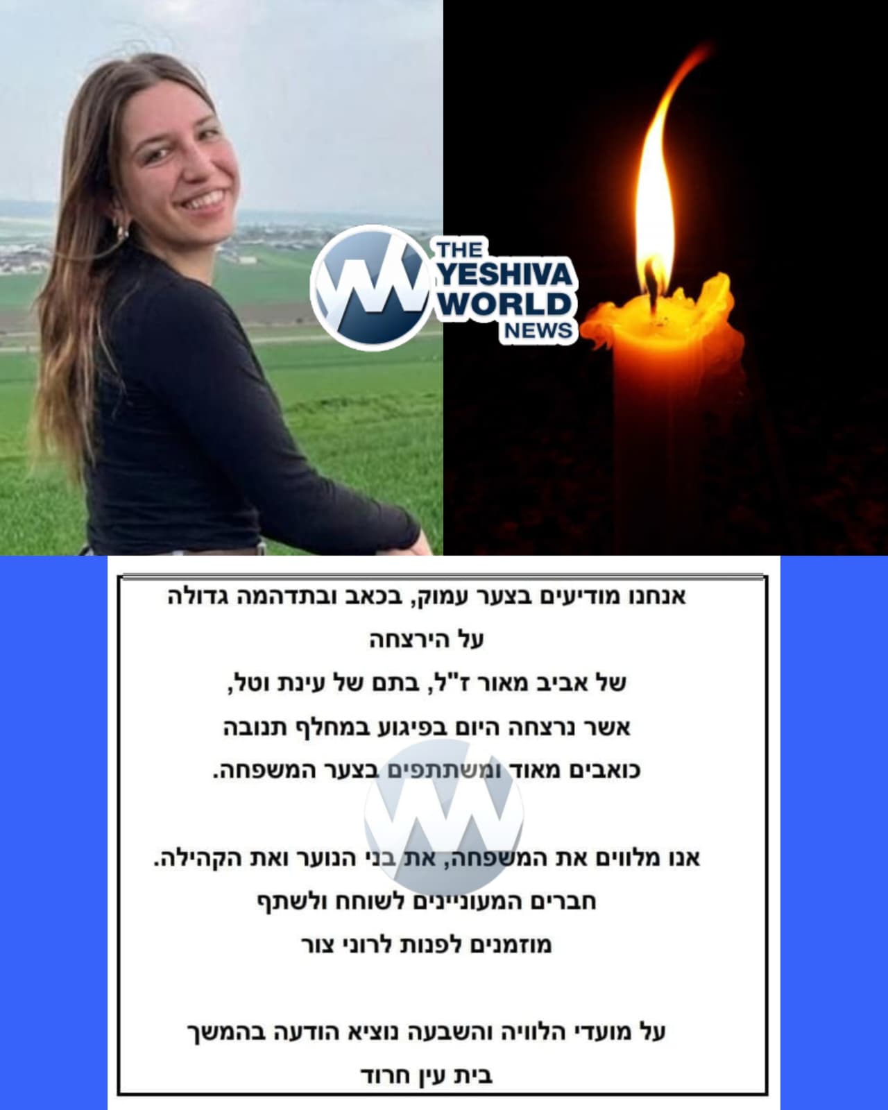๐ HY’D: The young woman murdered in the terror attack in northern Israel has been identified as Aviv Maor, 19, from Kibbutz Ein Harod.